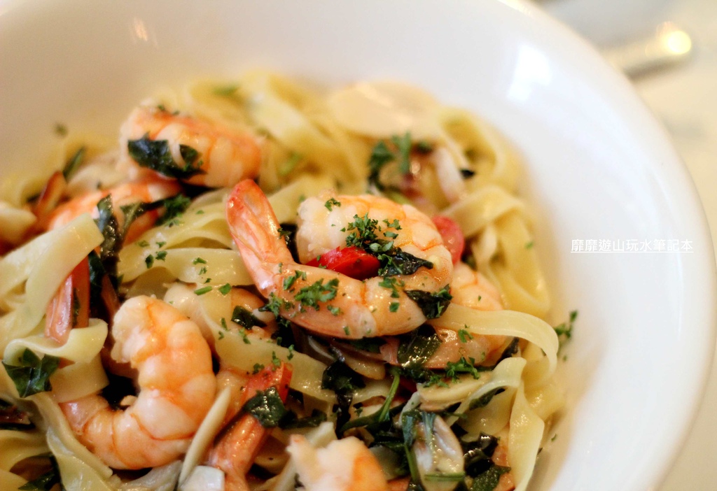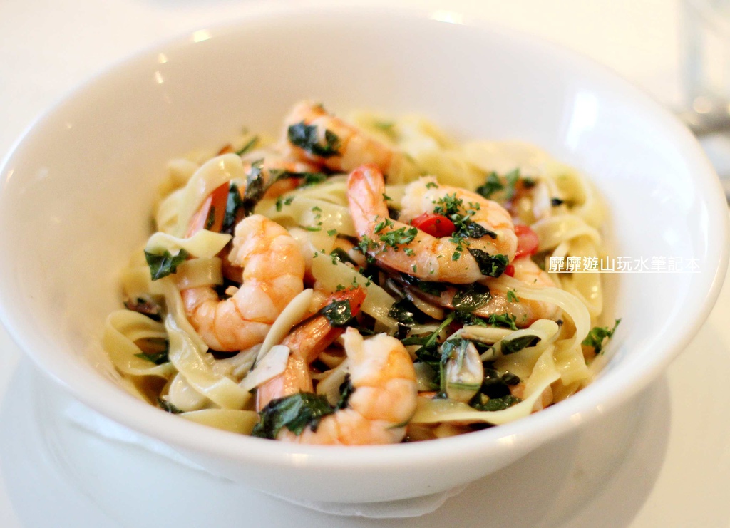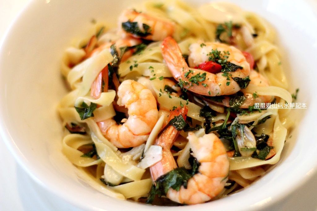 烤過的蝦肉香氣迷人,肉質有彈性份量也不少,在濃郁的羅勒氣息裡獨樹一格!