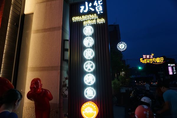 ▼直立的大扛棒強調真的炭火烤魚,在夜晚格外明亮,要人不注意也難,會讓人很想知道裏頭到底賣著什麼樣特別的料理?我們平常吃到的魚不是煎就是炸,水貨主打炭火現烤,吸引各地饕客特地前來品嘗,店門口擺放了接待的櫃台,忙碌地幫客人安排座位,有預約的客人可以直接等候專人帶位,現場排隊的客人很多,候位區人潮滿滿,生意好到強強滾。