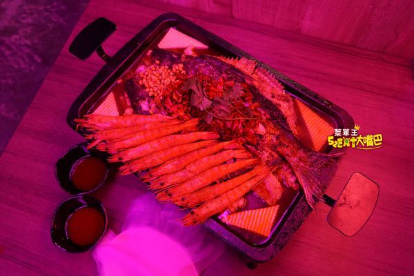 一上桌超吸睛,重慶烤魚上面放了10隻超肥美的斑節對蝦。烤盤下會有火源繼續加熱,建議上桌後可以再煮三分鐘會更軟嫩入味,吃大蝦搭配重慶烤魚實在太誘人了,瞬間引爆食慾!