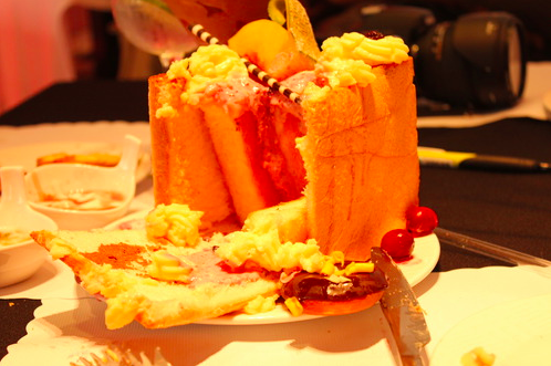 不過,準備開始享用它時,才知道挑戰要開始了。這個外表看起來很甜美的蜜糖吐司,要切它,還要有點技巧,我們技巧很爛,動作越來越粗魯,快要把它給破壞了,剛剛還再沉溺的優雅,頓時也要消失無蹤,店員來示範了。想要有個優雅的下午茶嗎?首先,先把上面的餡料緩緩的挾到一旁,接著,用夾子夾著固定,刀子斜角的從最邊緣的部份切下去。動作重複兩次,把吐司的其中一面牆,割開吧!!