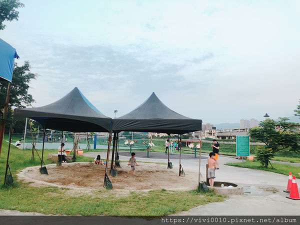 大大的沙坑,還很貼心的搭了兩頂客廳帳~讓小朋友們不用愛艷陽下玩沙