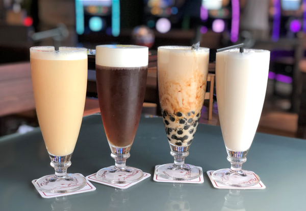 由左至右:多多綠茶/奶蓋紅茶/珍珠奶茶/冬瓜奶霜
