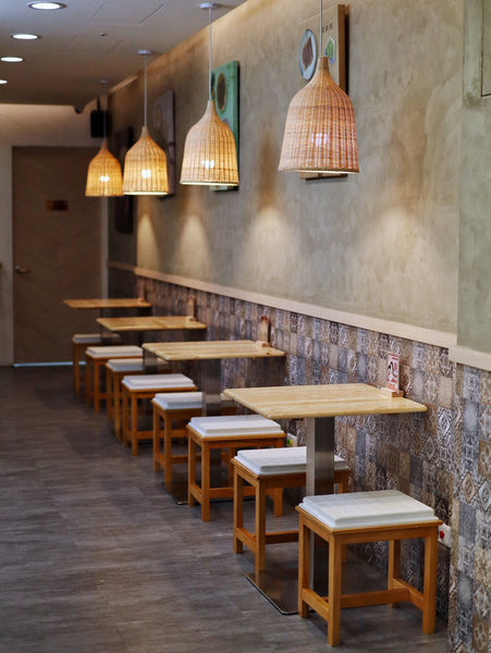 除了餐點之外,整體裝潢也偏向有設計感的自然風,板豆腐造型的椅墊座椅、竹籐編制的燈罩、磚花樣式的壁貼,以不同的風格表現出古早味元素,令人眼前一亮。