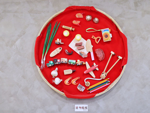 牆上有個抓周的模型,上面是給小朋友抓周的品項,你還記得小時候抓到甚麼嗎?我抓到的是筆喔!