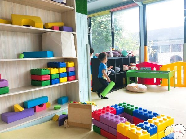 此區鋪設較多軟墊,也有小型溜滑梯、鞦韆及搖搖馬,還有一櫃子的軟式大積木,讓孩子動手拼裝激發創造及想像力。