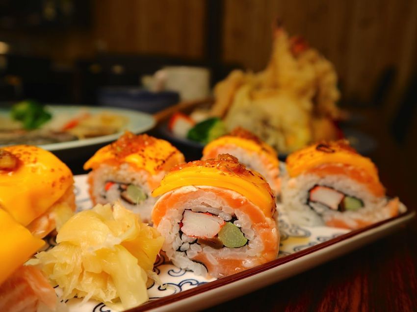 整條的鮭魚捲壽司 先炙燒後,再鋪上起司片,淋上特製沾醬