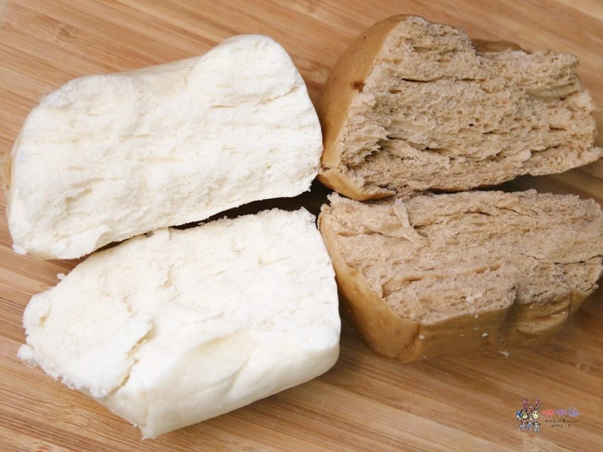 全麥饅頭是我蠻喜歡的,沒有那麼甜又吃的到一點全麥的口感,讓我想到小時候挺愛喝的胚芽奶茶。另一個也是養生路線的黑糖五穀饅頭,有黑糖香味,而且看的出來料放很多,下的本也很重,但是這麼健康的東西一直就不是我的菜,哪哪婆會比較喜歡吧!