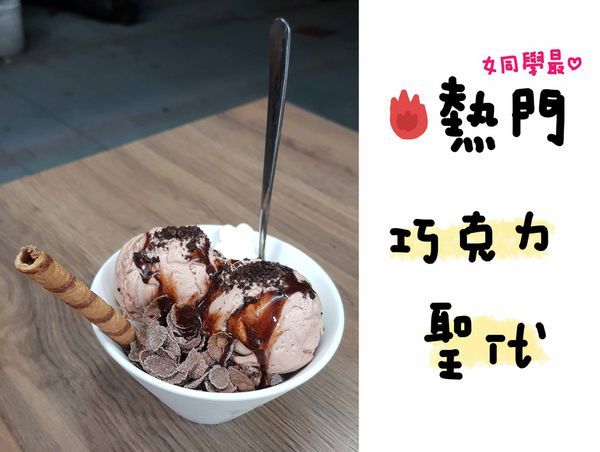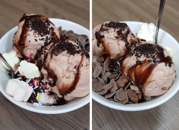 不僅有兩大球巧克力冰淇淋,上頭還撒了巧克力粉跟巧克力醬