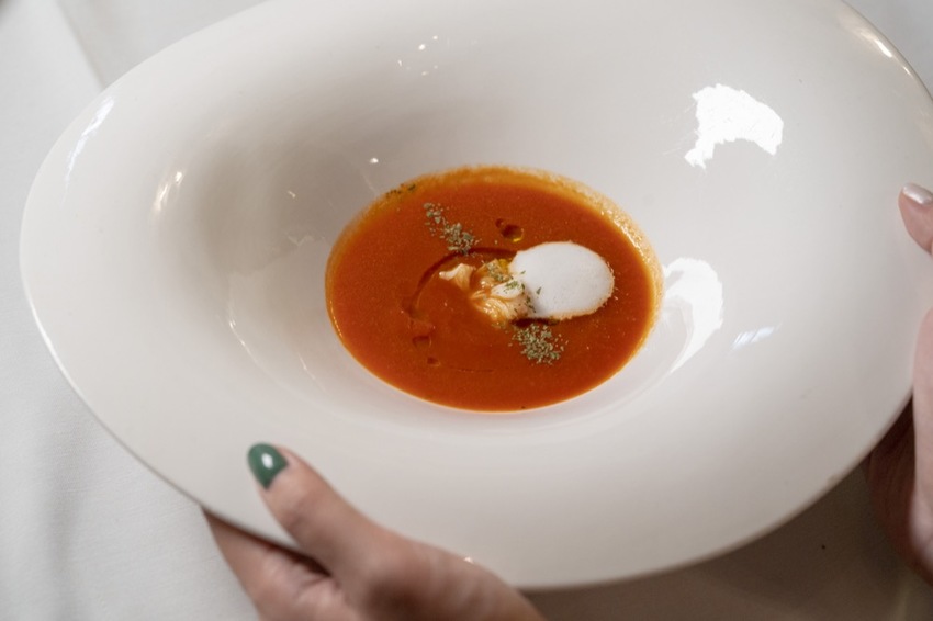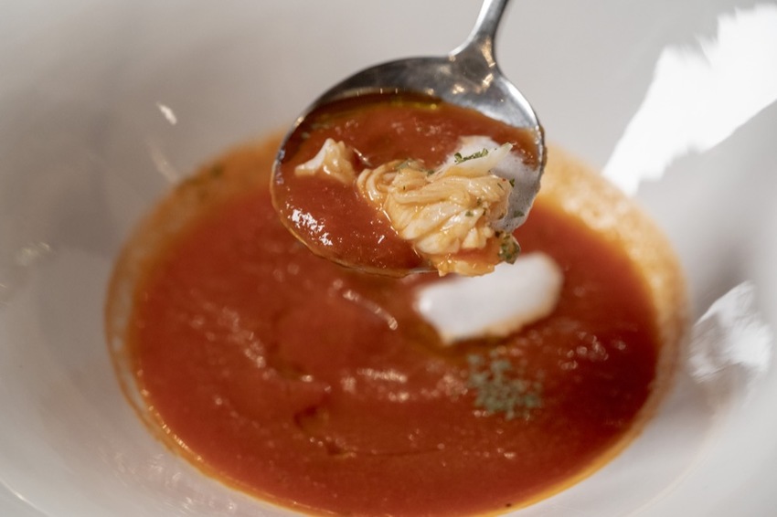 第一口先把龍蝦肉喝進去,番茄蔬菜濃湯