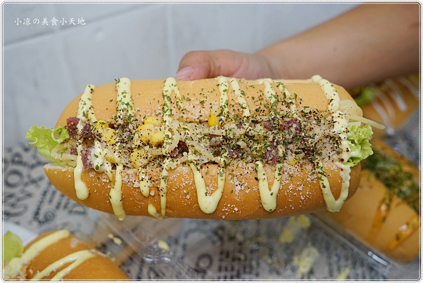 大企的份量夾入麵包體內再淋上沙拉醬,浮誇的炒麵麵包登場~