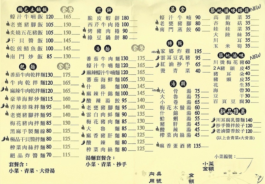 鍋巴土鍋飯、乾麵、煎餅、湯麵、蒸食、特點、湯類、築地滷味、新品推薦等