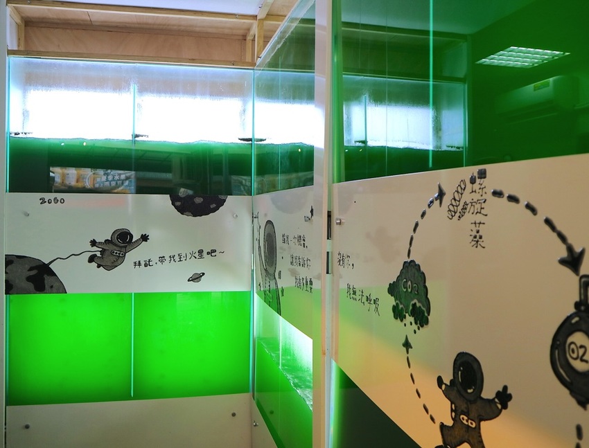 《2060太空吧》最特別的是,櫃台右邊有一大面的 綠色液體牆面