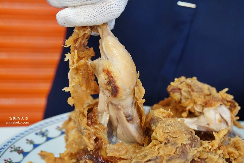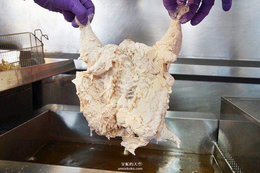由於炸全雞全程都用大火酥炸,所以整隻全雞保有完整的肉汁與水分,最豪邁的吃法就是用手套用手耙雞的方式將想要吃的部位豪邁拉起,看,這雞腿肉油亮亮的,酥炸過後一點也不柴喔。