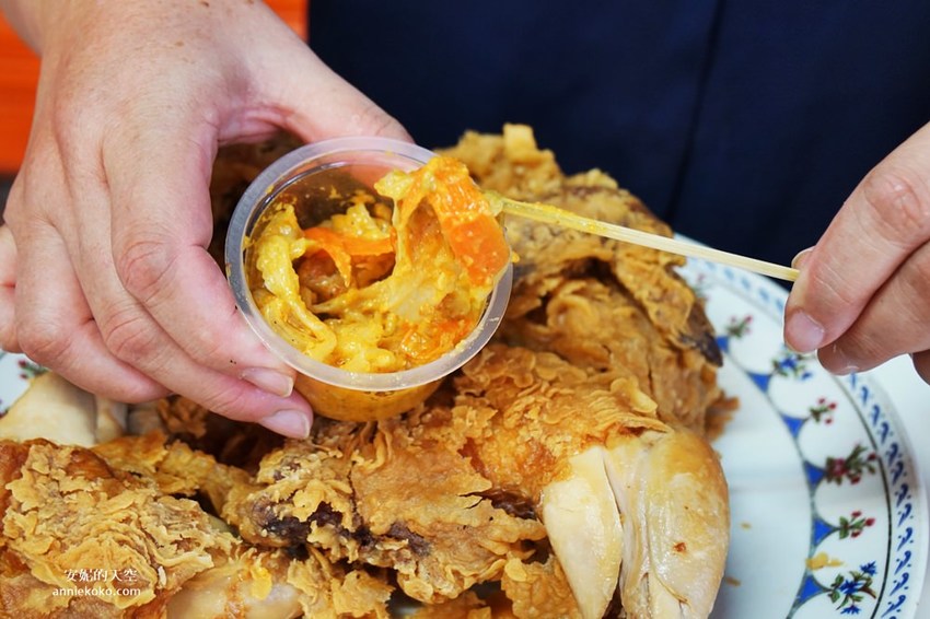 卡拉粉可是全雞好吃的重要關鍵,卡拉粉均勻鋪好整隻全雞,等等就準備下鍋酥炸了。