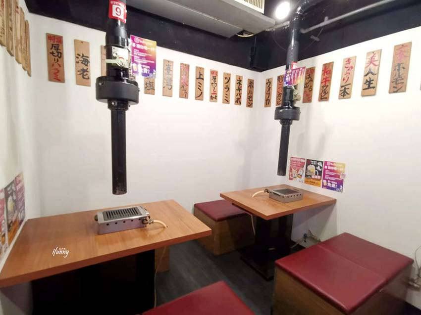 走入大阪燒肉 燒魂YAKIKON的店內後,發現內裝幾乎是沒什麼更改。自天花板垂降的吸煙器,桌上的烤爐等,都是很熟悉的。