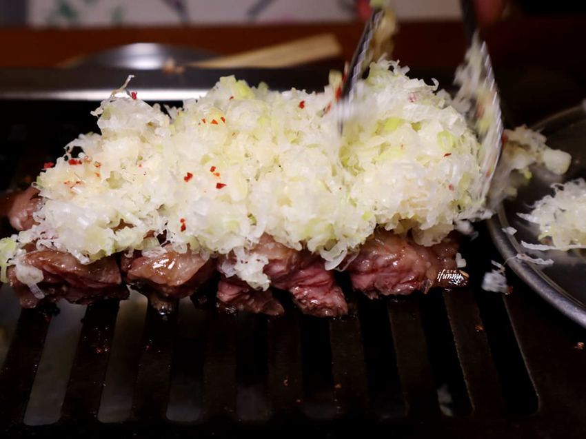 剛剛的蔥花再大量地放在烤好的橫隔膜之上。對了!大阪燒肉 燒魂YAKIKON的蔥花相當細緻且沒有辛辣味,是很好入口的喔!