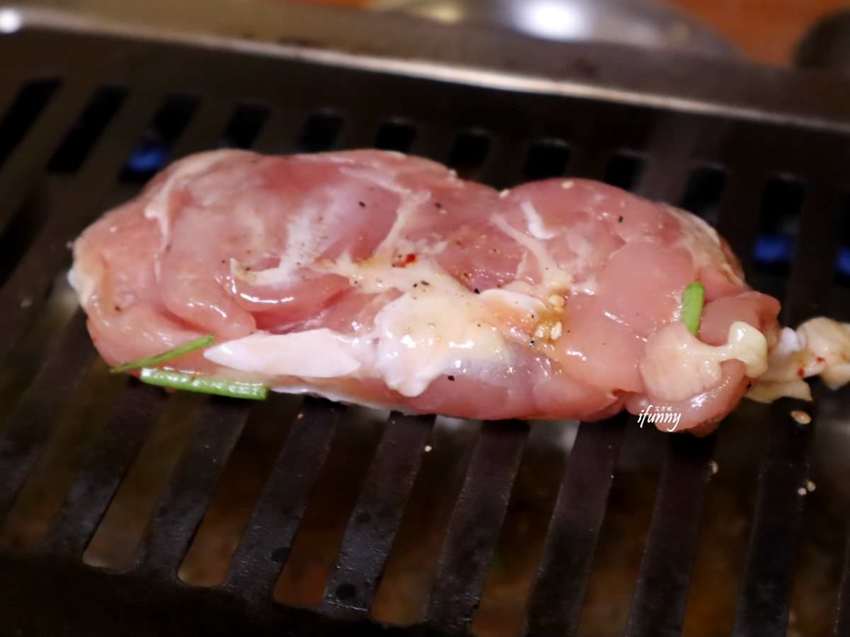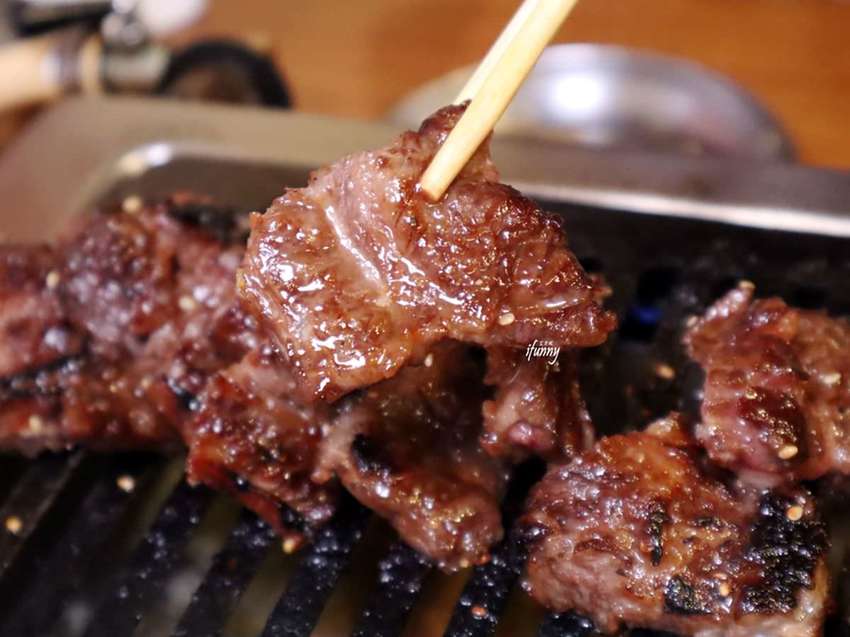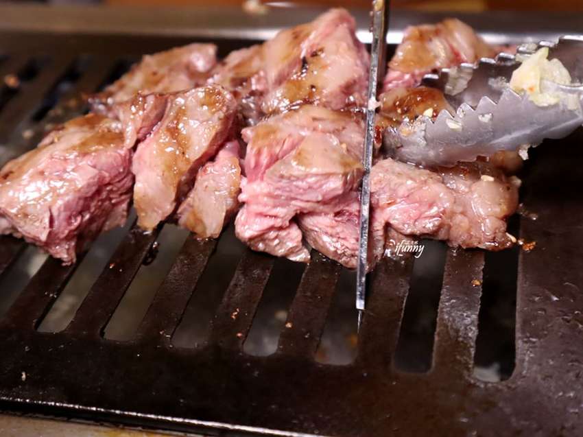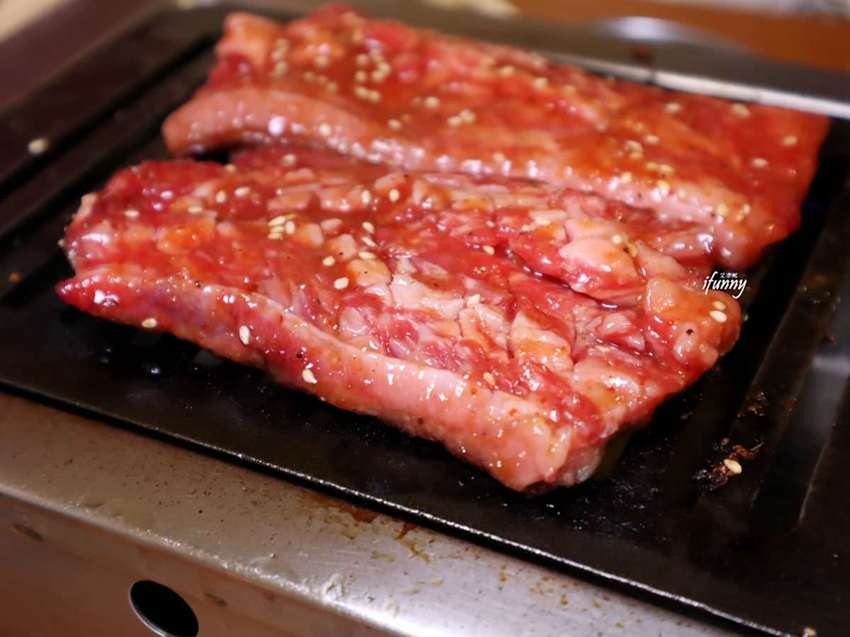 在煙霧飄散之中,可以發現牛肋條是已經事先醃漬上色,其上還可見到蒜末及芝麻。