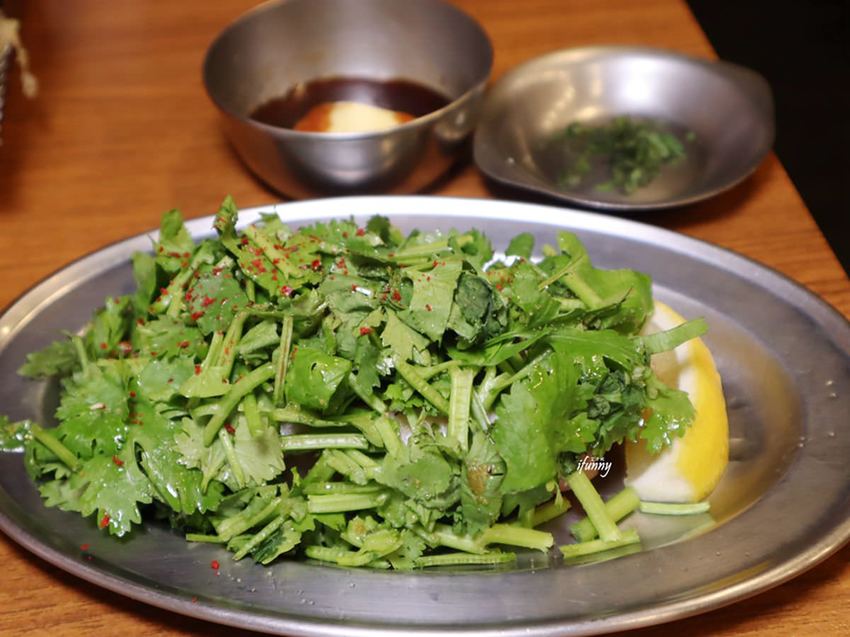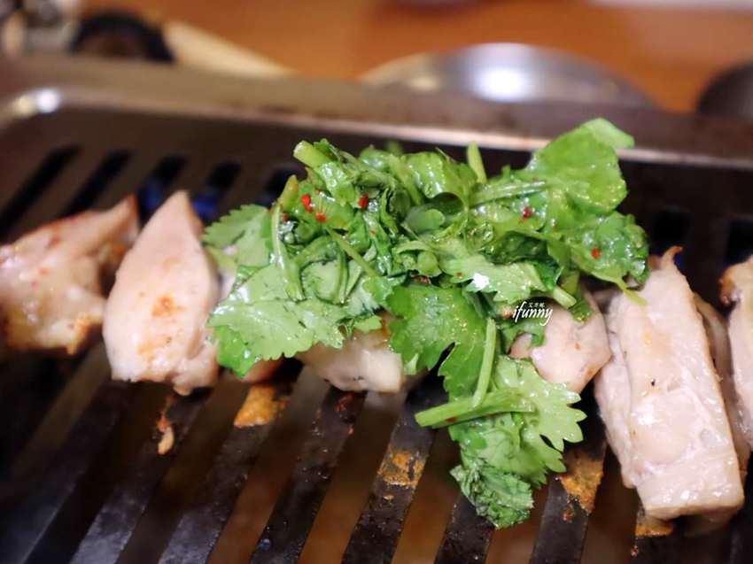 烤完後的雞肉,可以三吃。一吃其原味,二吃加了香菜,(若不吃香菜可換成蔥花)。香菜控覺得非常滿意!