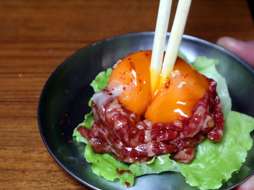 此時艾方妮央求友人吃上一口,她眼睛睜大大地跟我說,這吃來好像鮭魚生魚片喔!這生牛肉一點腥味也沒有,蛋液帶來的潤滑感,吃來一點都不像是牛肉,反而有生魚片的沽溜感,難怪友人不僅敢吃,而且還給予好評呢!