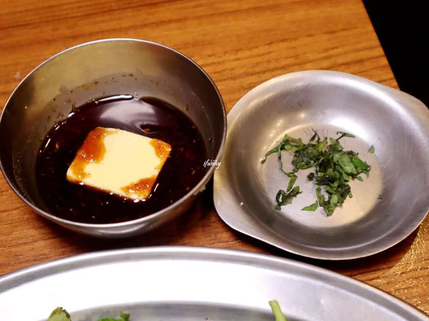 點餐後,先上了沾醬,左為加了蘿蔔泥的橘醋醬,右為加了芝麻的烤肉醬。但其實大阪燒肉 燒魂YAKIKON的肉大部份有醃漬過,所以沾醬的用量並不多。