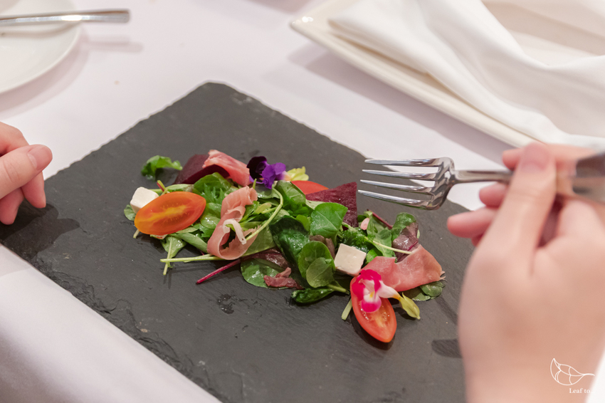 季節性的生菜沙拉,搭配伊比利火腿、甜菜根、番茄、乳酪塊和油醋醬,其間還裝飾有食用花卉,讓放在黑色石板上的沙拉看起來不只是葉菜類的混搭,更加富有獨特美感。