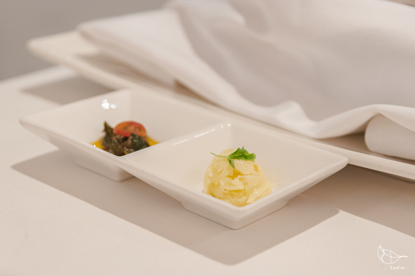 餐前附上的兩款手工麵包是切片的巧巴達麵包和竹炭餐包,兩種截然不同口感的麵包被包裹得保持著暖呼呼的,再隨意依自己喜好沾取兩種沾醬,當天提供的是檸檬奶油醬和主要以羅勒製成的紅青醬。