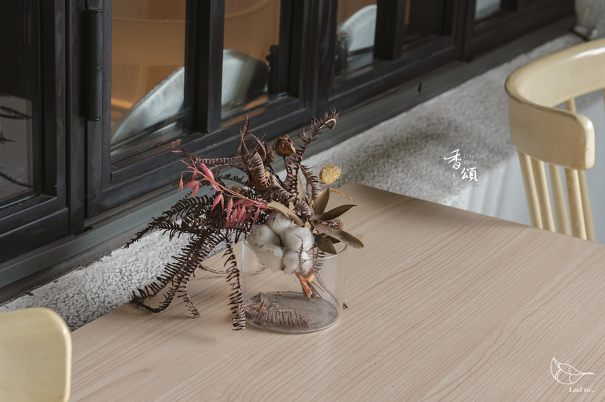 按下門鈴,待服務人員打開大門之後,映入眼簾的庭院讓我感到相當有桂香私宅的庭院的即視感,庭院裡的木製長餐桌以及桌上的擺設,幾乎自成一幅最美麗的餐桌風景。我特別喜歡香頌的庭院雖然不算特別寬敞,但擺放許多植栽,讓整體看起來充滿綠意生氣。