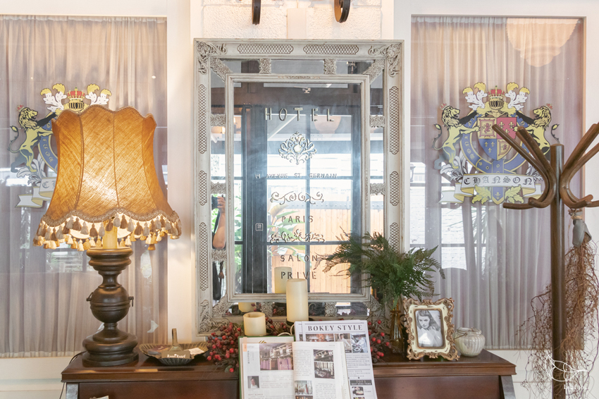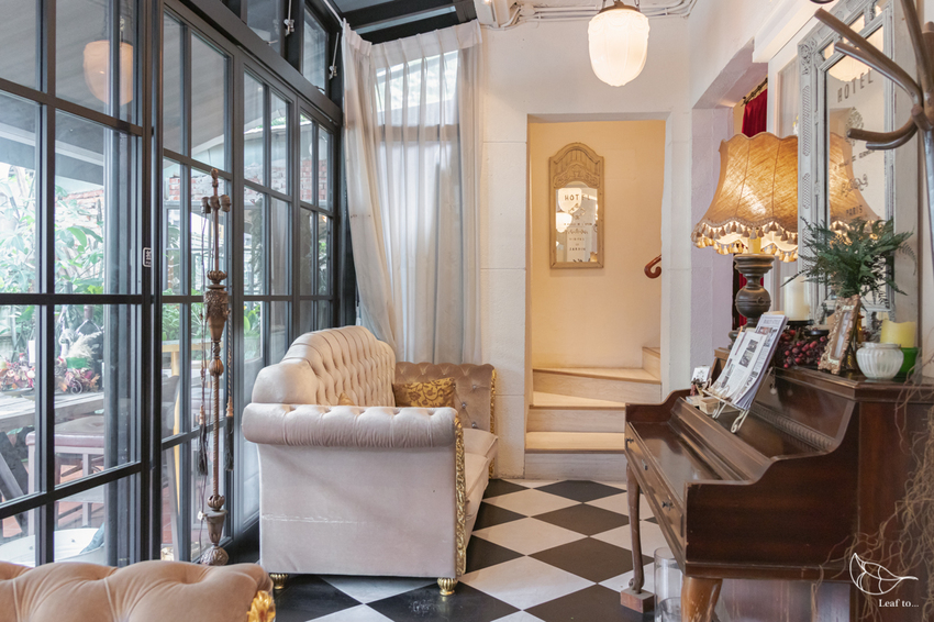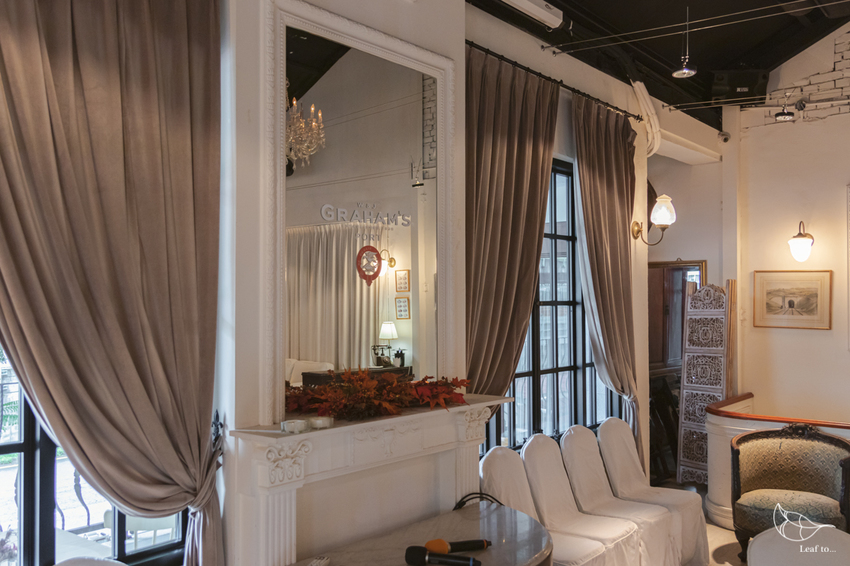 進到室內玄關,特別吸引我目光的,便是正對門口的木造鋼琴以及上方的雕花鏡子了,即便只是裝飾都顯得優雅;且兩旁玻璃貼上了香頌私宅洋樓如同英國皇家徽章般的LOGO,更增添了如同貴族般的不凡。