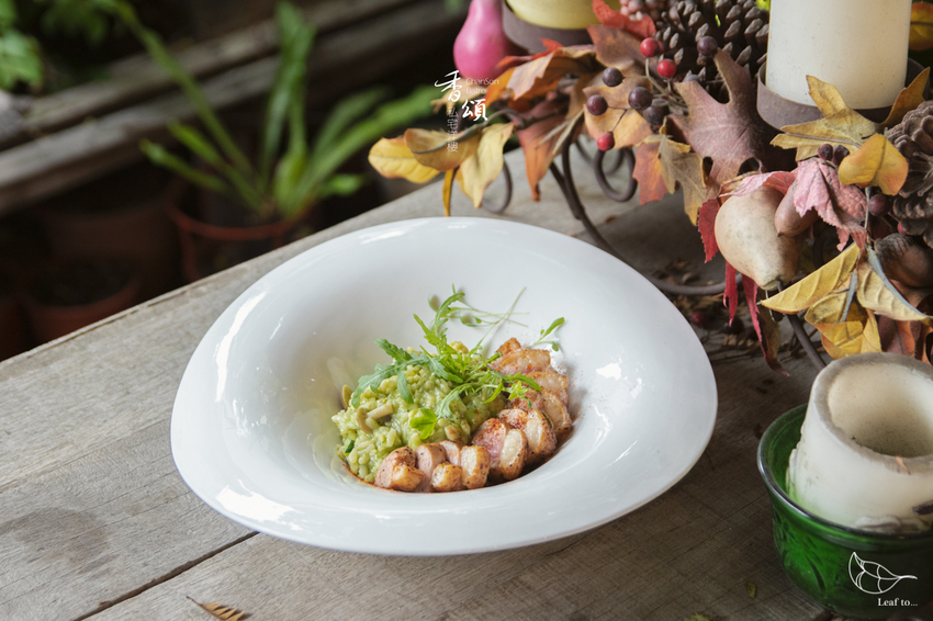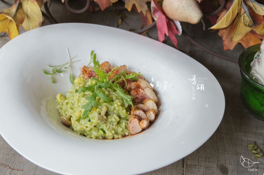 而我選擇的青蔥醬汁燉飯和板煎脆皮鴨胸,則讓我在這樣的經典組合中感到有些許新意。對我來說,青醬鴨胸燉飯是自己十分喜愛的搭配,香頌以青蔥醬取代一般僅以羅勒製作的青醬,多了不同層次的香氣與微微嗆辣感。