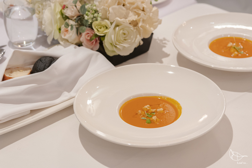 香頌提供的番茄濃湯口感十分濃郁,且整體酸度較明確,我自己第一口本來感到有些刺激,不過越喝越順口,或許是因為酸度夠,所以即便湯本身稠度高,也不容易覺得膩口、反倒越尾端越順口。