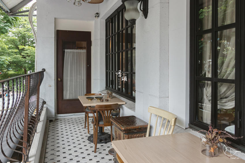 不過要說起二樓空間,最讓我留戀的絕對是二樓戶外的小陽台了。在門口張望著這幢洋樓時,就已經不自覺地盯著天花板的復古式吊扇猛瞧;真的來到二樓陽台,簡約的桌椅和地磚,僅是搭配著背後的大扇窗戶和窗簾、曲線漂亮的欄杆,以及眼前的綠樹林蔭,就已美不勝收。