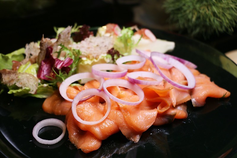 挪威茶燻鮭魚搭配酸豆、洋蔥、檸檬,軟嫩好吃!