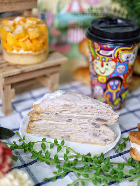 最後芋頭的濃郁著實讓我咋舌,厚厚的芋泥的存在感幾乎都要超越千層本人,照片中可以明顯看到塊狀的芋頭,口感豐富又綿密,我愛芋頭(手比愛心)