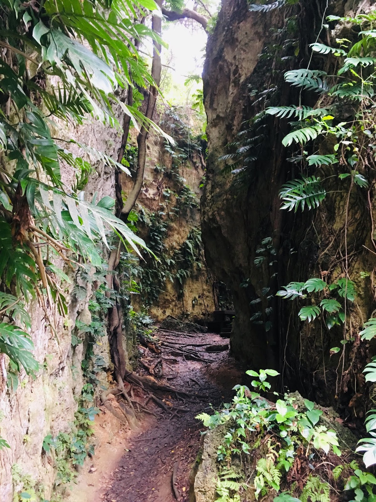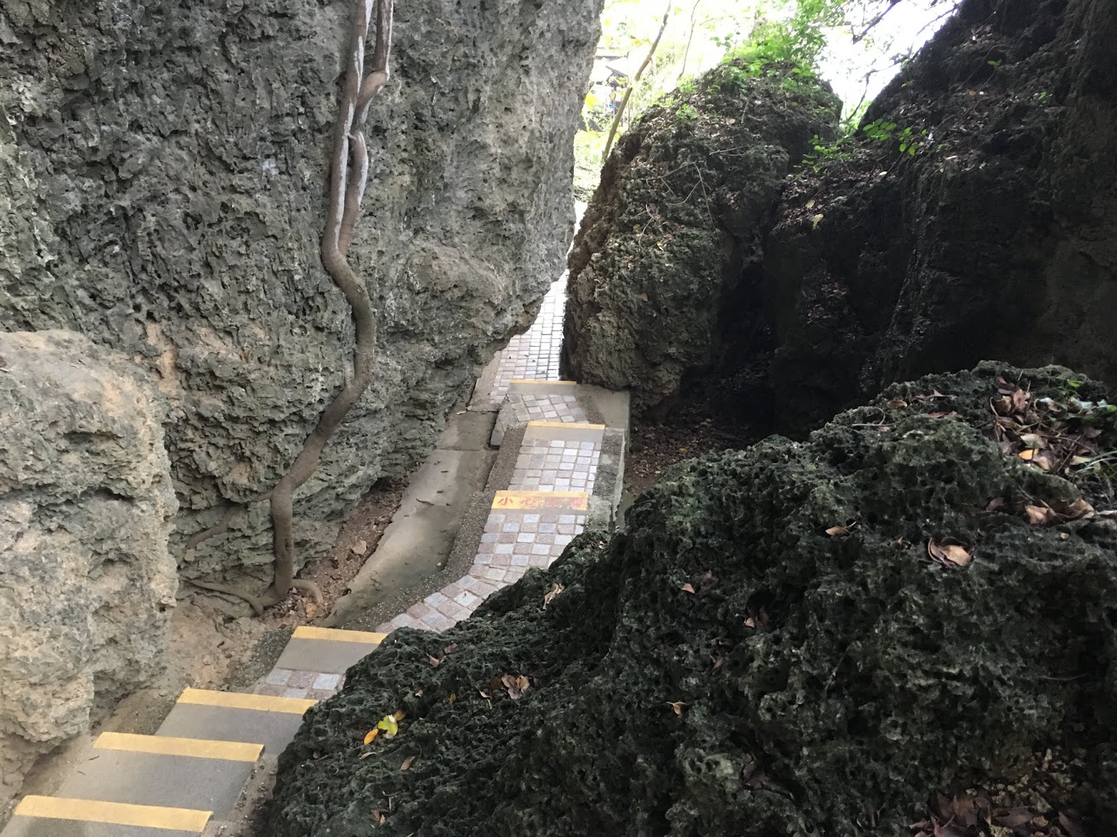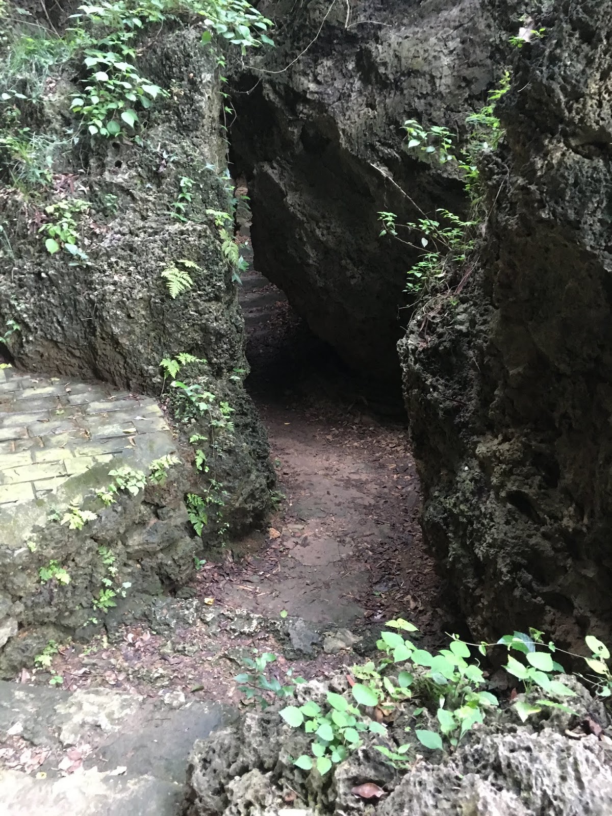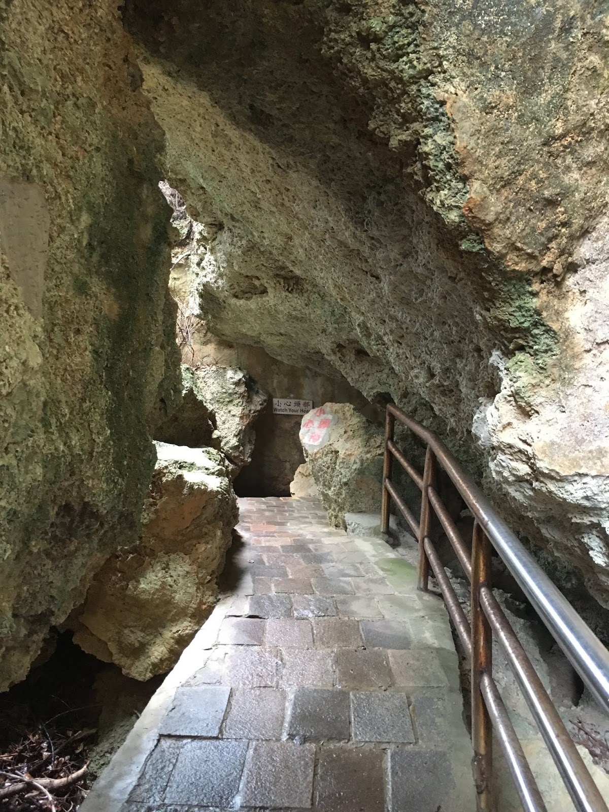 「山豬溝」是沿著天然珊瑚礁地形而開發的景點,木棧道走起來很輕鬆,兩旁生長著雀榕及攀藤植物,走來舒爽宜人。印象最深的是如同泰山壓頂的「礁岩石洞」,低下身子穿過時很有壓迫感,以及低矮帶狀的「防空洞」,也讓我驚嘆以前人在裡面躲避空襲,柔軟度實在太好了。