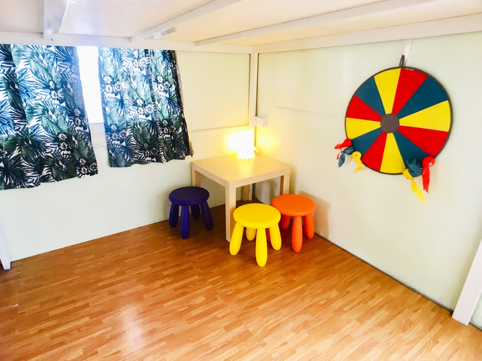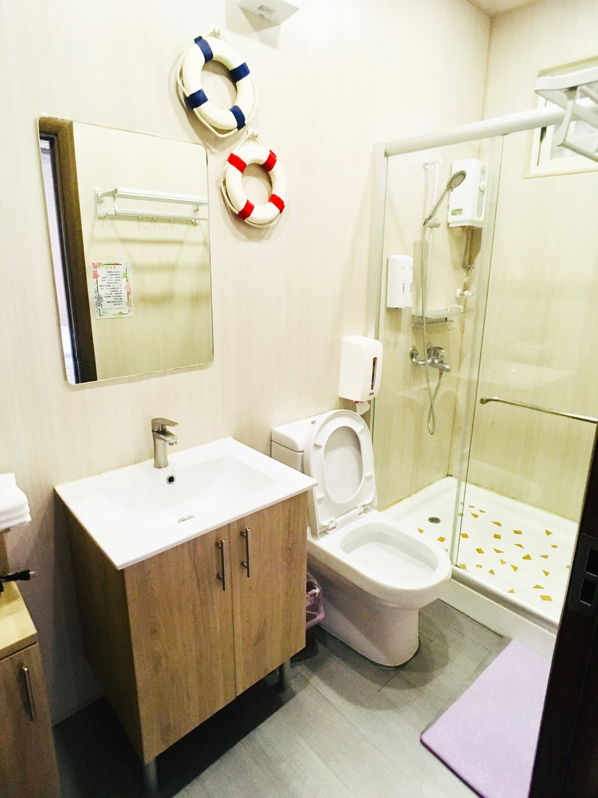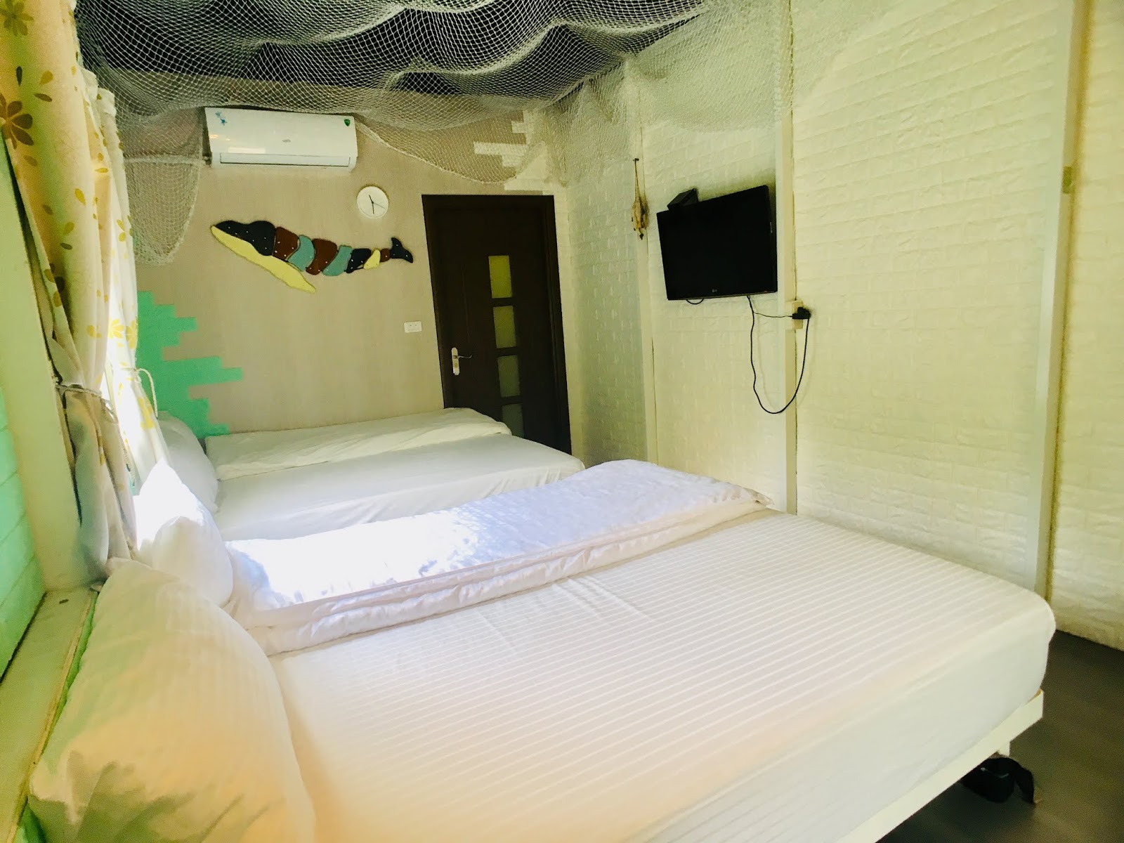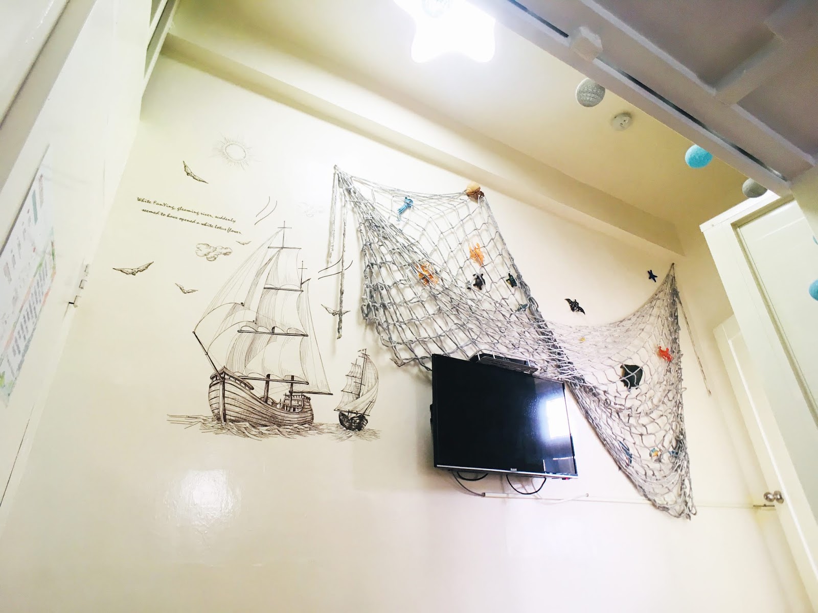 在等房間整理好時,花媽請我們在「交誼廳」稍坐一下,「交誼廳」天花板有漁網做裝飾,頗有海洋意象,格局像是客廳一樣,有舒適的沙發床,也有卡啦OK、書籍、桌遊和玩具供大家娛樂,竟然還有乾濕分離的衛浴!雖然這間沒有放在官網上,但其實沙發床攤開也是一個舒服的套房了。