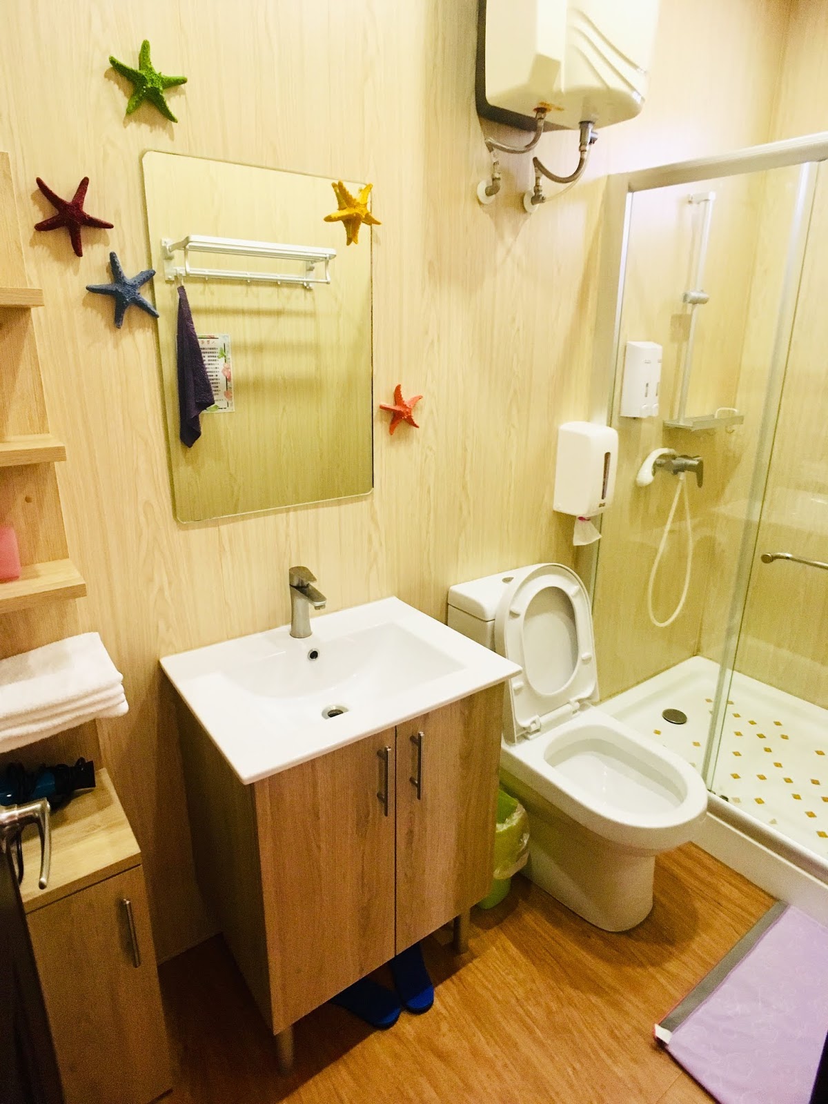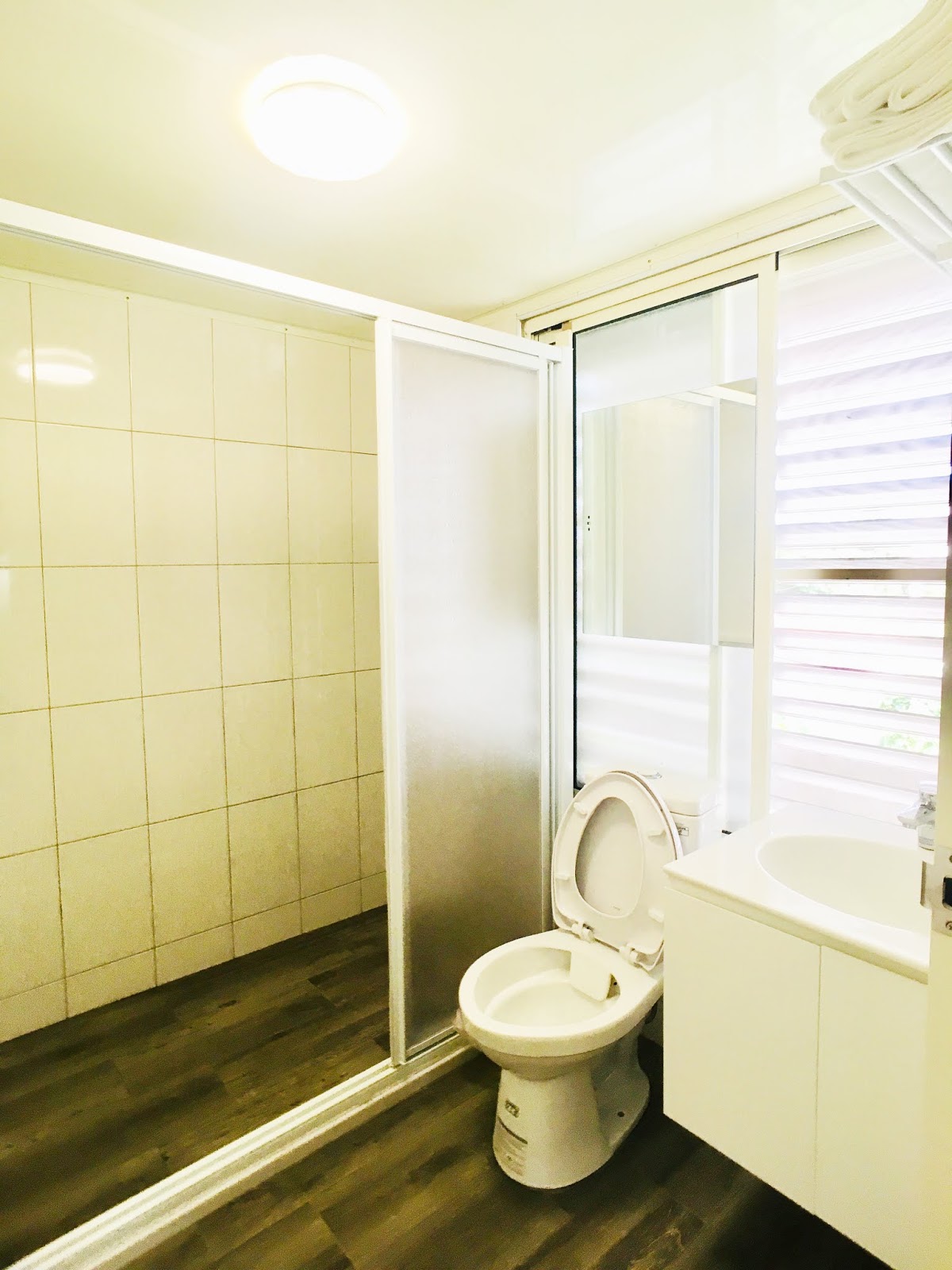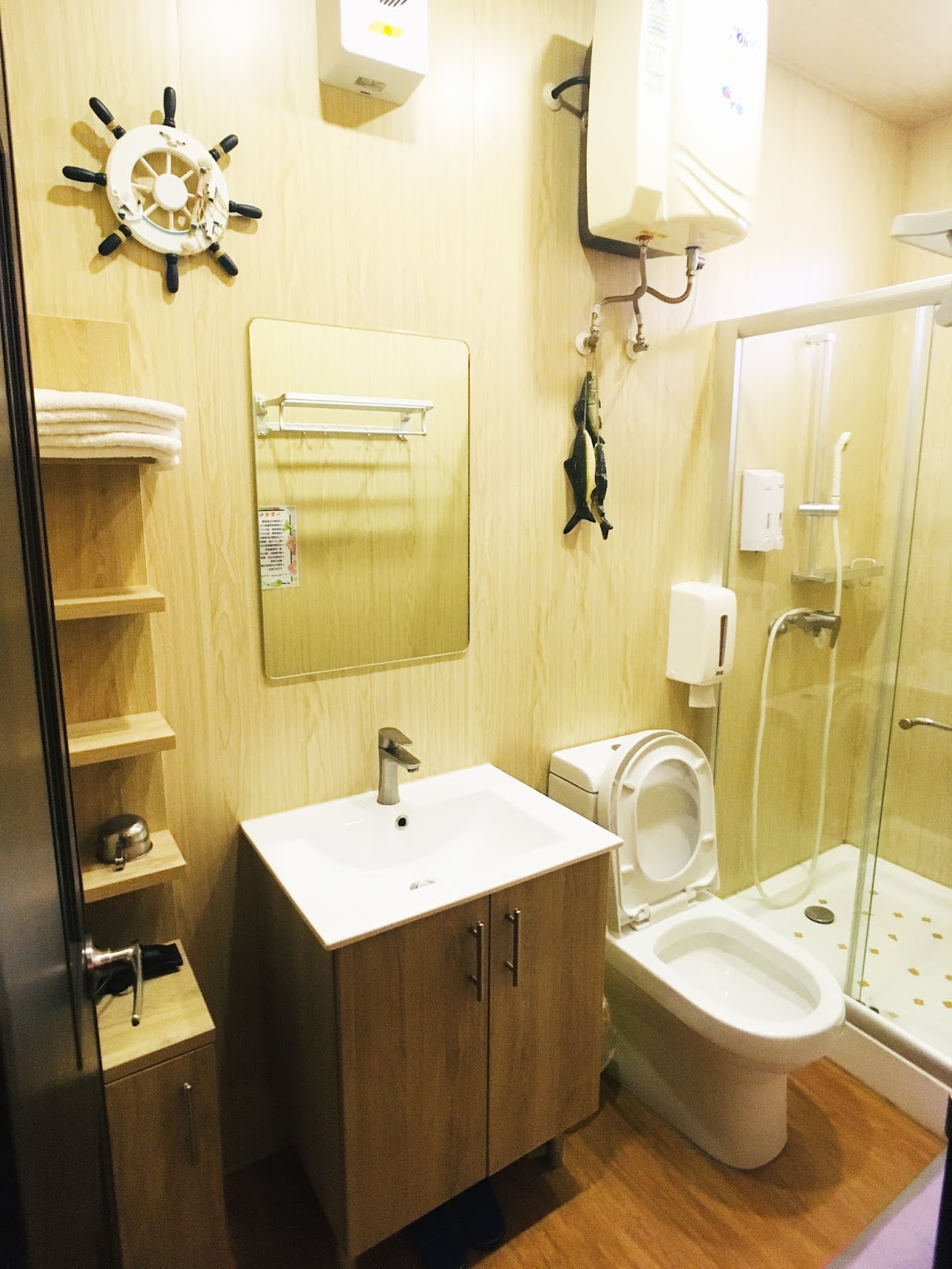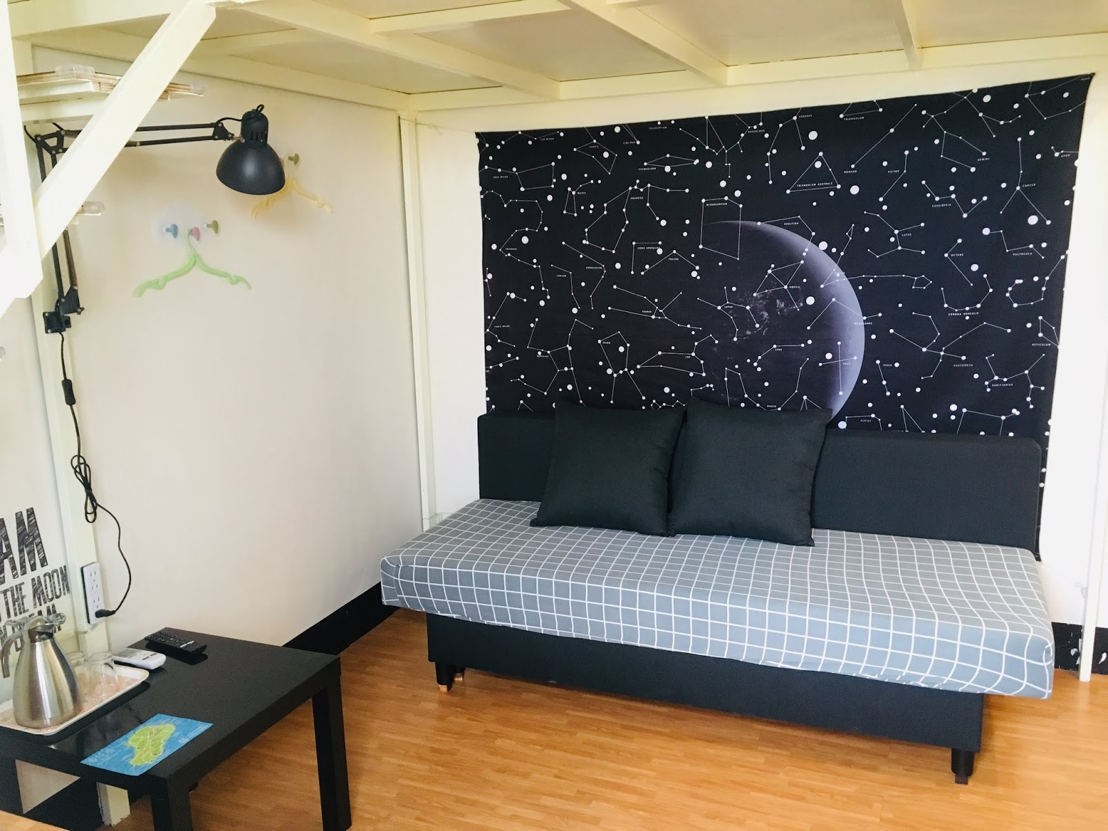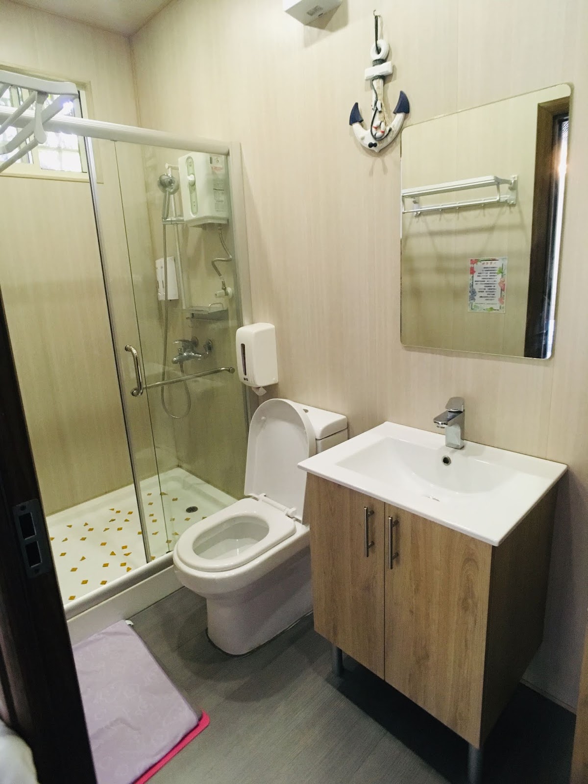 在等房間整理好時,花媽請我們在「交誼廳」稍坐一下,「交誼廳」天花板有漁網做裝飾,頗有海洋意象,格局像是客廳一樣,有舒適的沙發床,也有卡啦OK、書籍、桌遊和玩具供大家娛樂,竟然還有乾濕分離的衛浴!雖然這間沒有放在官網上,但其實沙發床攤開也是一個舒服的套房了。