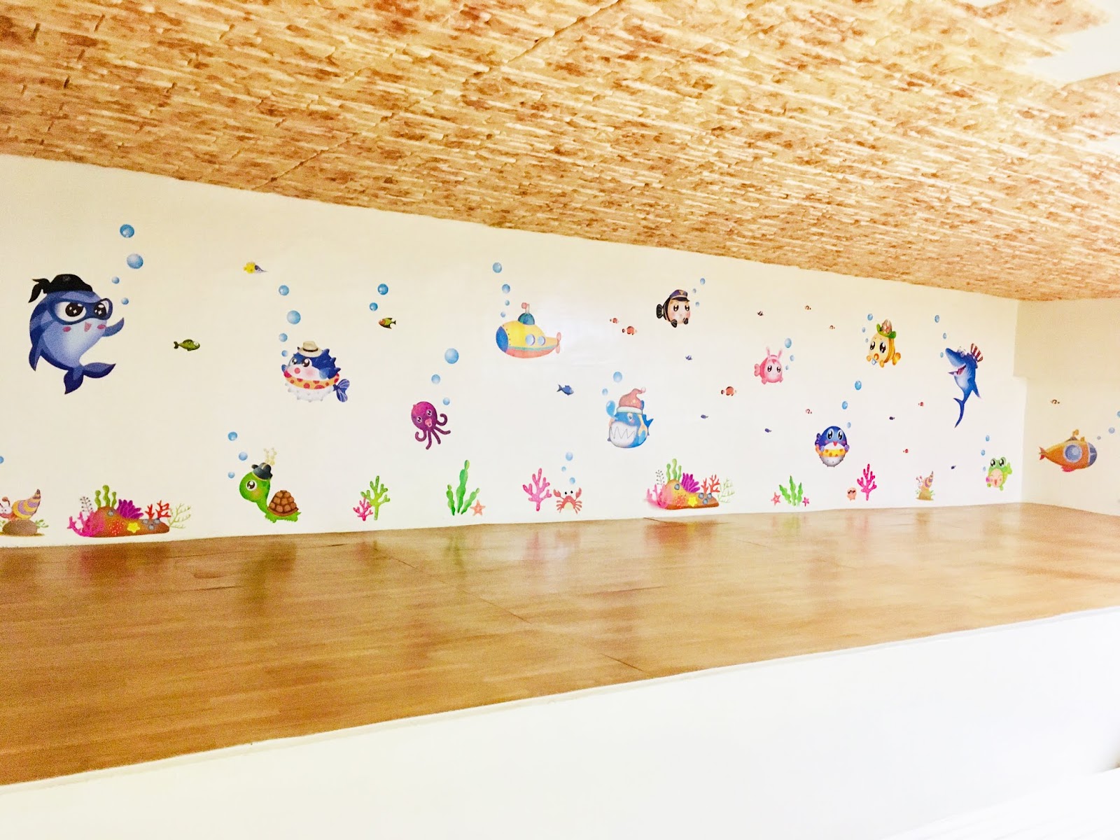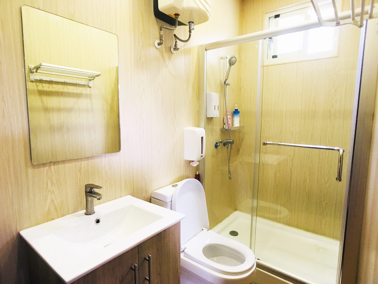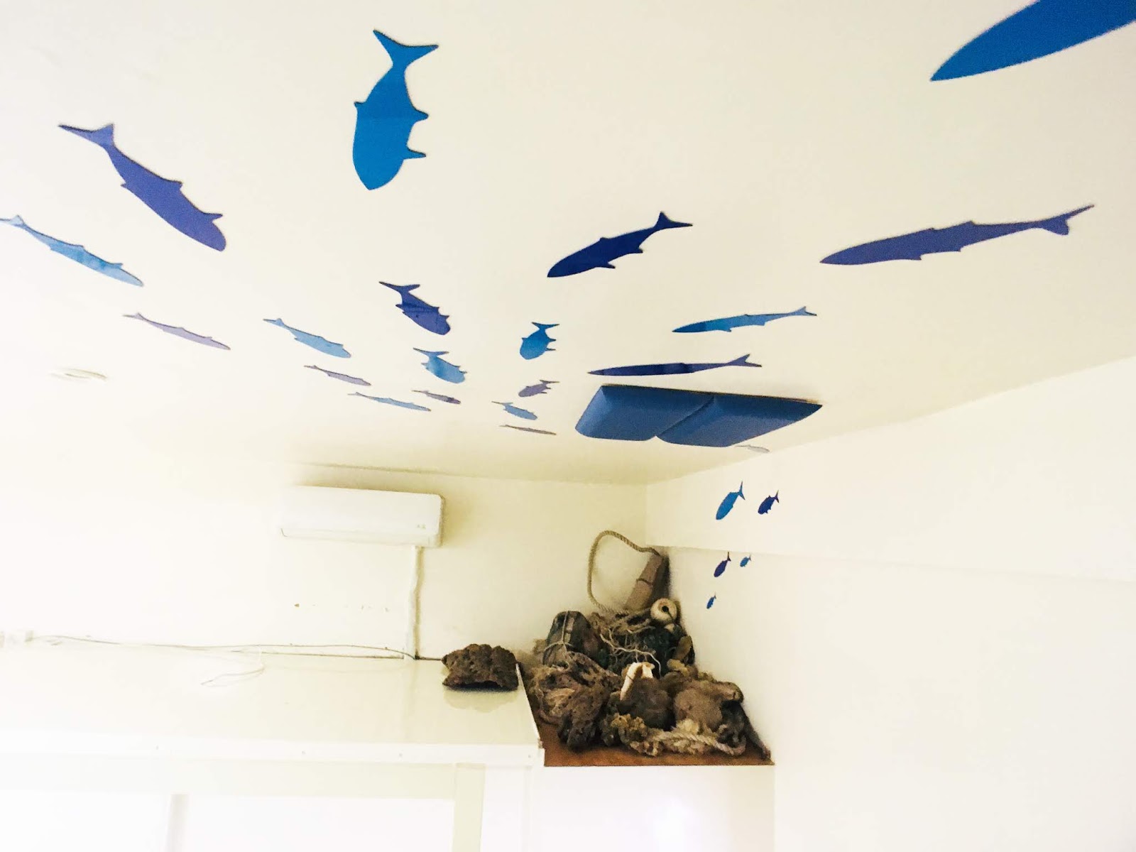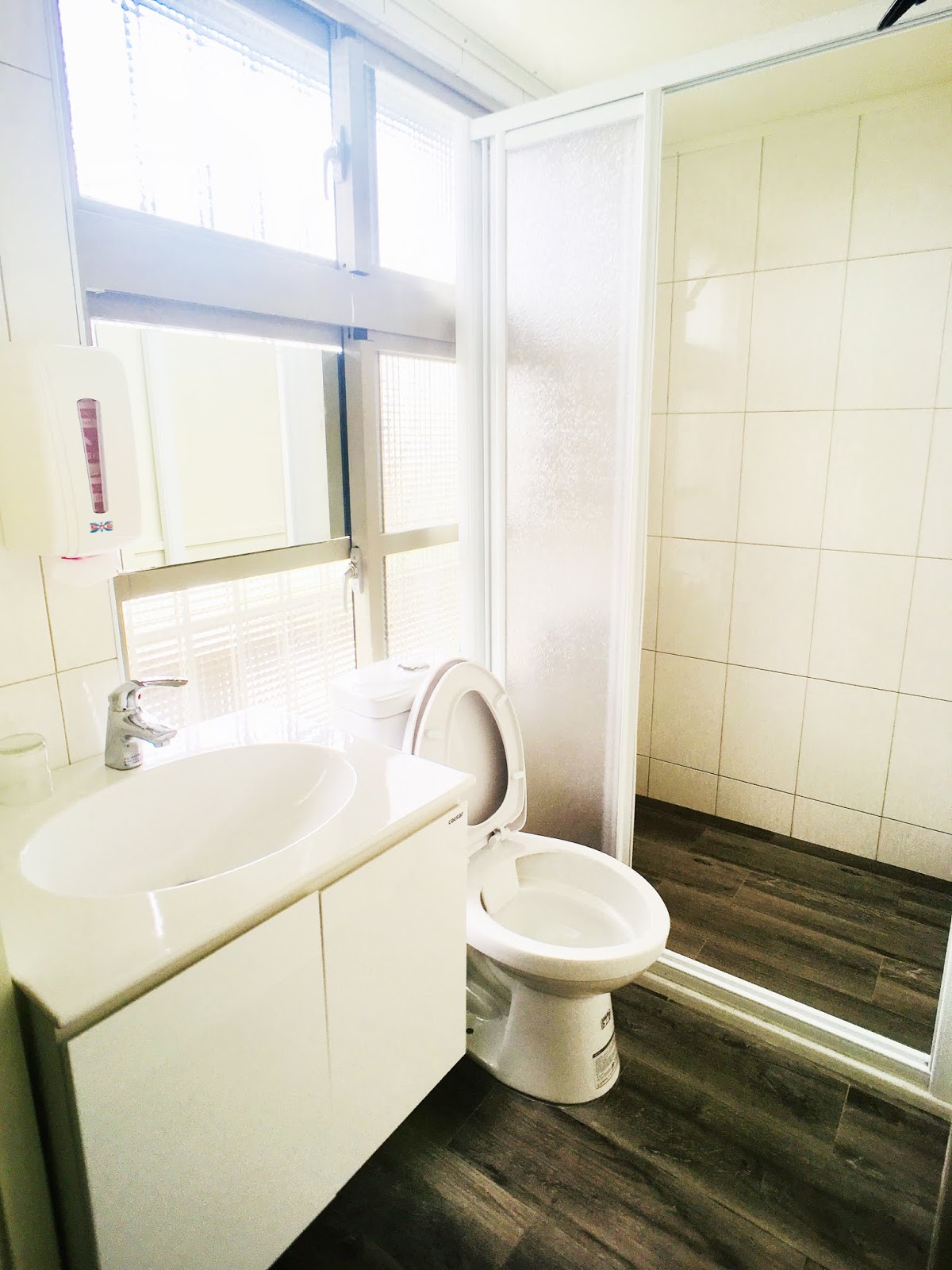 在等房間整理好時,花媽請我們在「交誼廳」稍坐一下,「交誼廳」天花板有漁網做裝飾,頗有海洋意象,格局像是客廳一樣,有舒適的沙發床,也有卡啦OK、書籍、桌遊和玩具供大家娛樂,竟然還有乾濕分離的衛浴!雖然這間沒有放在官網上,但其實沙發床攤開也是一個舒服的套房了。