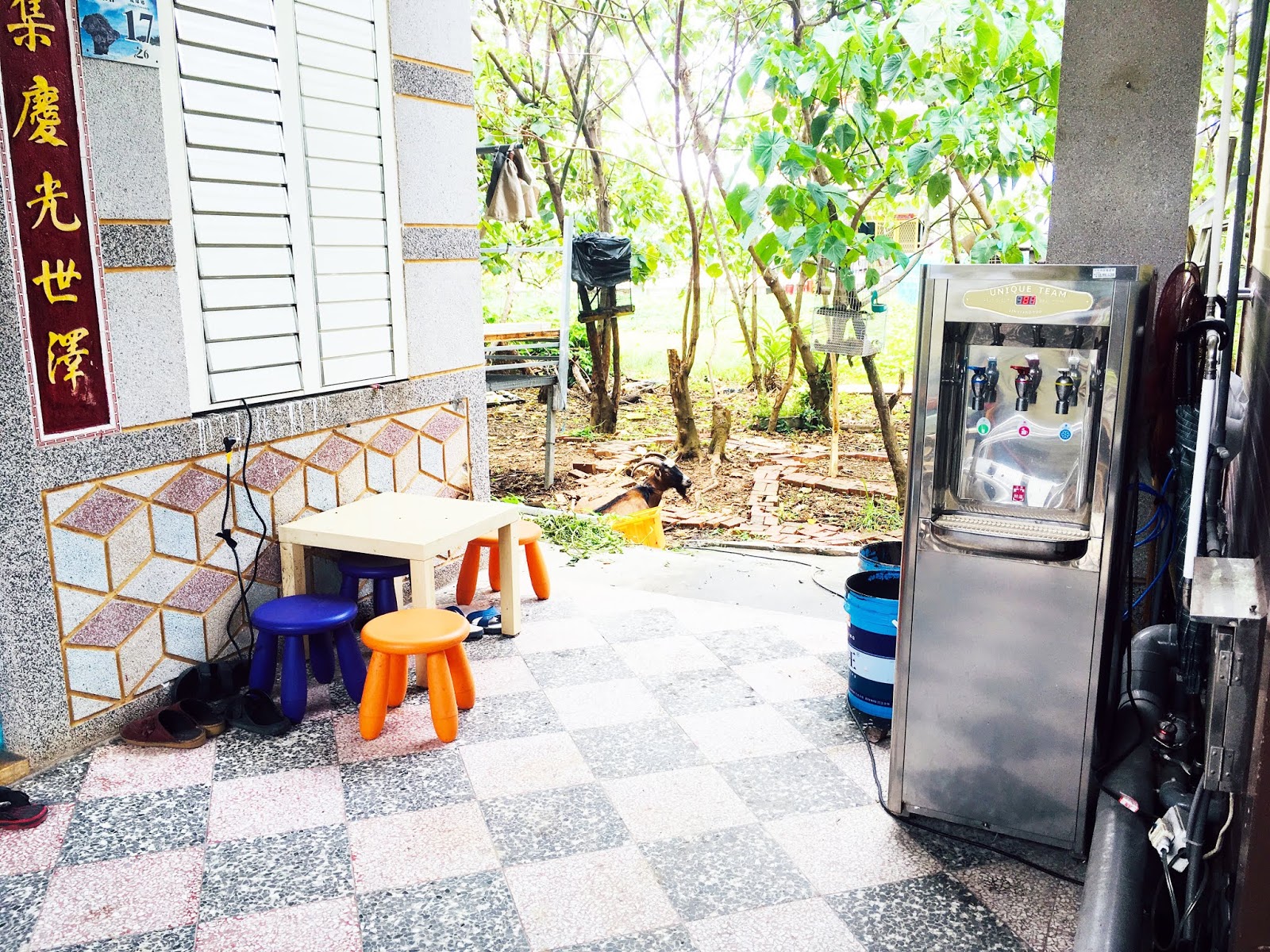 從門口一側看去,柱子旁有飲水機,要幫孩子泡奶很方便,再走過去是民宿附設的小小動物園。