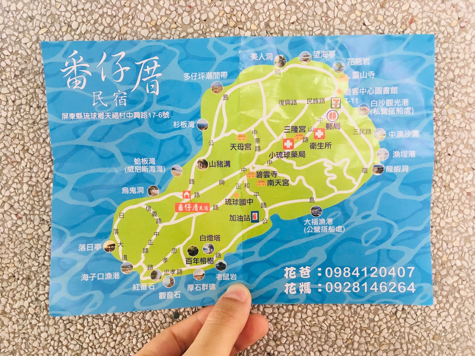我們在東港碼頭出發時,先打電話給民宿主人花爸和花媽(0905044101,0928146264),請他們在半小時後來小琉球碼頭的「澎坊免稅商店」門口幫忙載行李。由於我們的電動機車是租24小時,考量到遊玩的時間,是先暫時借民宿的機車,到民宿稍事休息再去取車。