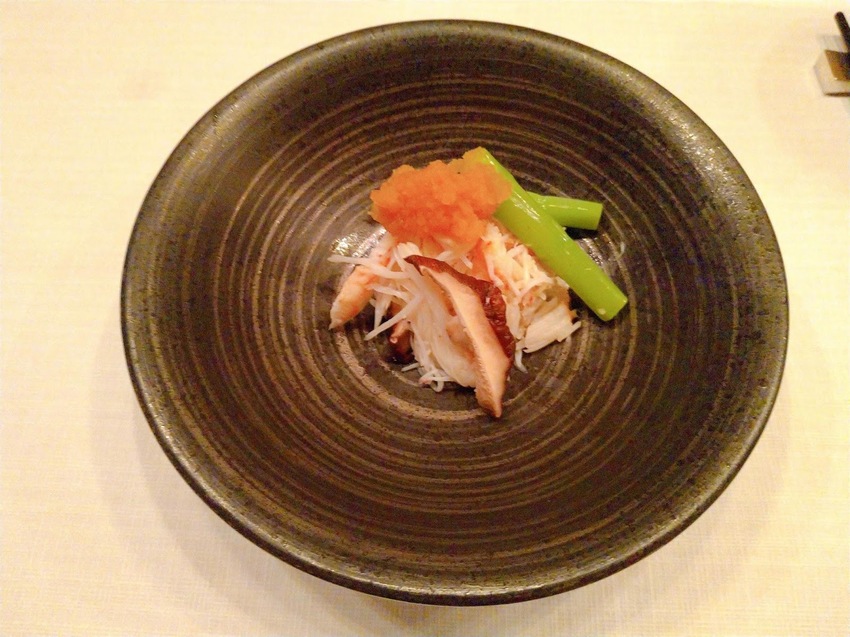第三道是松葉蟹,蟹肉已經幫客人挑出處理,肉質很鮮甜,上面墊鋪的辣蘿蔔泥也做的細膩。
