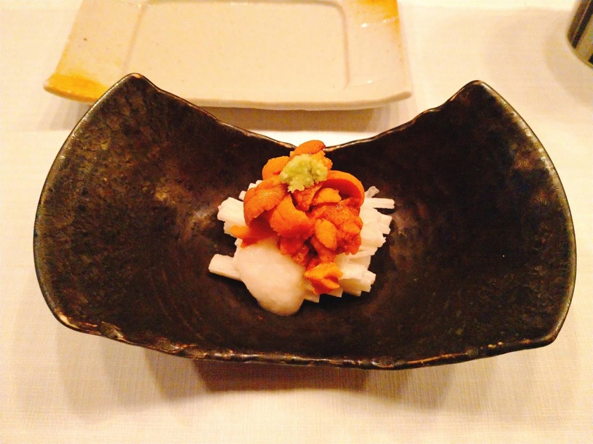 美食家友人Darren之家人與店長熟識,因此本次依前例由師傅幫客人依季節性做料理配菜,完全取材自食材的鮮味,而無做太多人工調味。前菜的山藥海膽,除了山藥泥還有將山藥切成絲,新鮮的海膽完全沒有腥味。對於口味稍重的朋友,可以加點醬油提味。