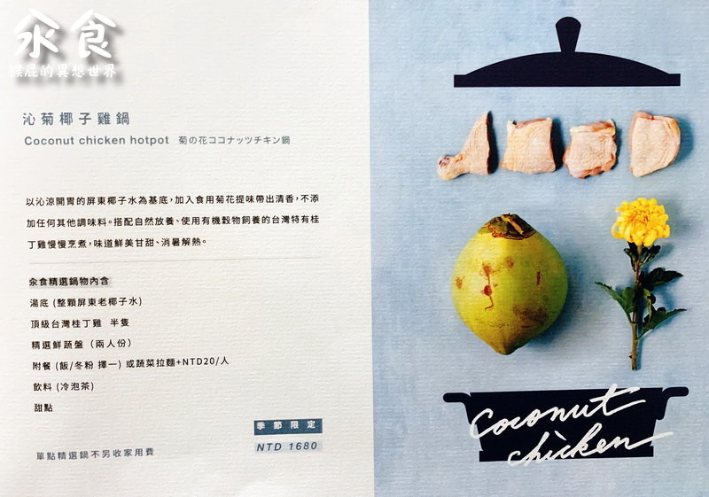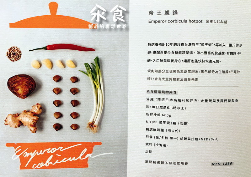 汆食有特色的是帝王蜆鍋跟椰子雞鍋,若3~4人,可以點一鍋大鍋其他在單點歐