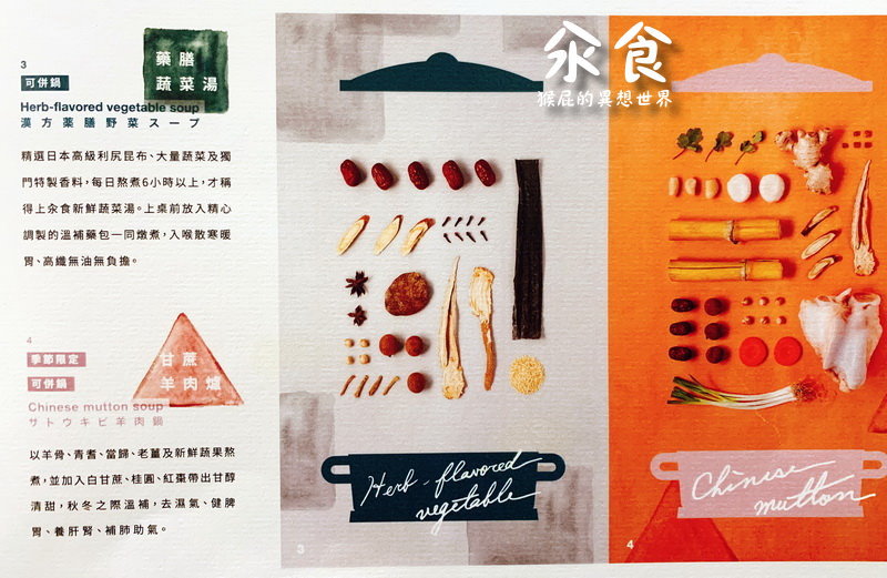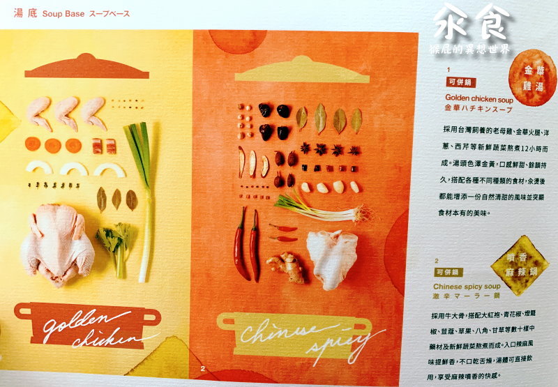 另外還有含四種湯底任選一種(金華雞湯、噴香麻辣鍋、藥膳蔬菜湯、甘蔗羊肉爐)