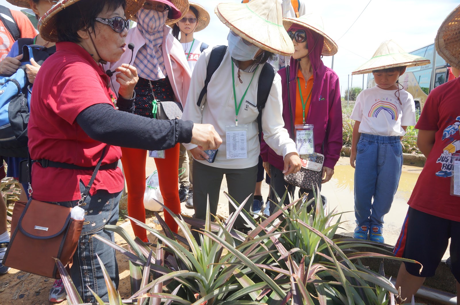 導覽人員解說著鳯梨電土放進鳳梨心催熟的古早作法、鳯梨栽種品種和鳯梨採收的方式,就算是烈日下,也不減大家的興緻。
