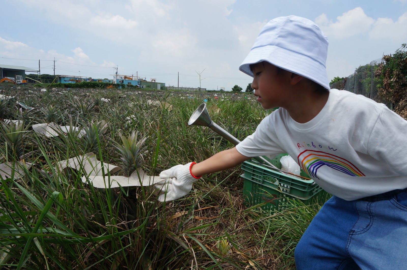 到了龍目社區,準備採摘鳯梨了!鳳梨田裡的鳯梨跟我們一樣都怕曬,個個都戴起了帽子,真可愛!
