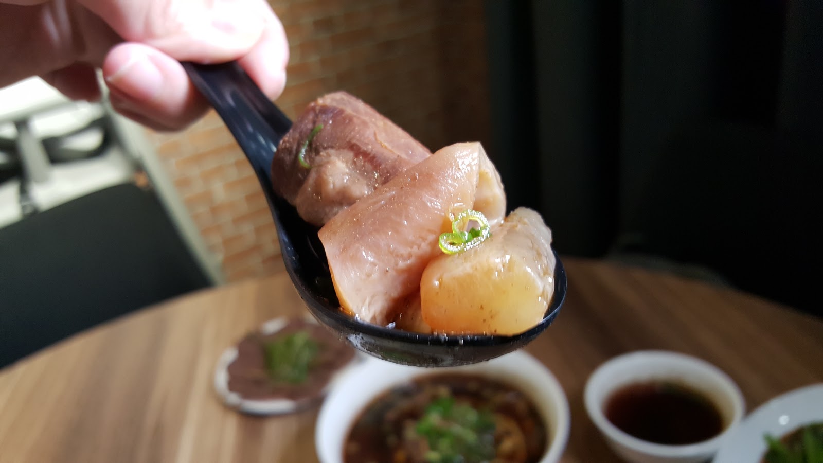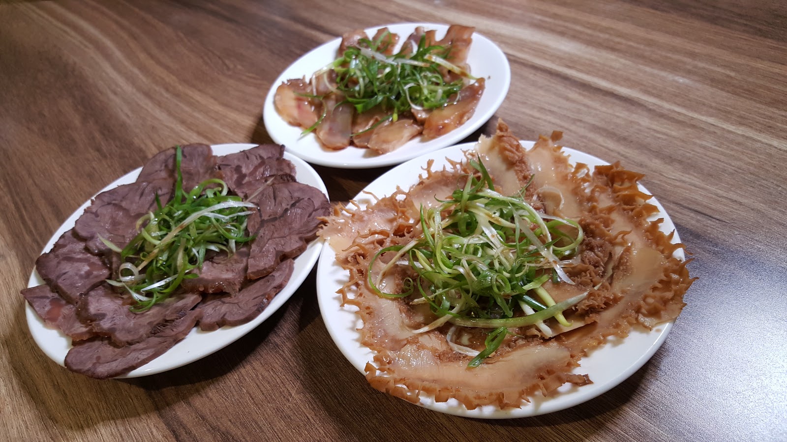 牛肉三寶:牛腱、牛筋、牛肚。這三樣味道都很夠,滷牛肚和滷牛筋我第一次吃,牛肚較Q彈但是不黏牙,牛筋煮得很軟,幾乎碰到牙齒就分解,牛腱口感扎實,最耐嚼。上面都擺了一把蔥絲,不知為何蔥和滷菜就像是胭脂馬和關老爺,如此天作之合。(年輕朋友一定看不懂我的梗... QQ)