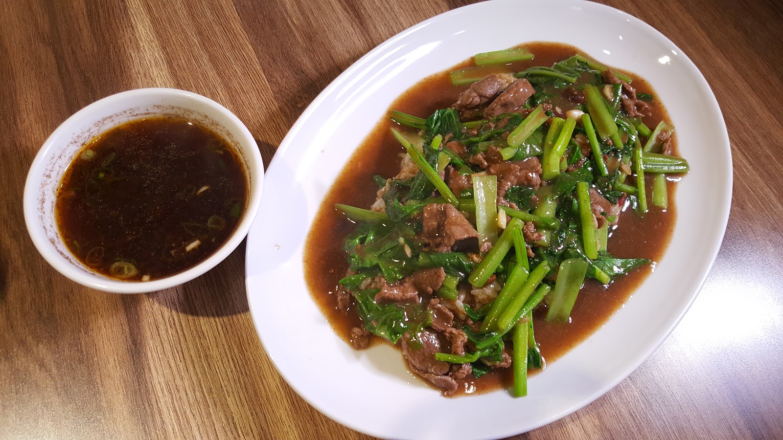 炒麵和燴飯都有附一碗牛肉湯,和牛肉湯麵使用的湯頭是相同的,讓想吃飯的人也嚐得到這家店的精髓。用牛肉片和油菜燴飯,醬料的基底是不辣的豆瓣醬。