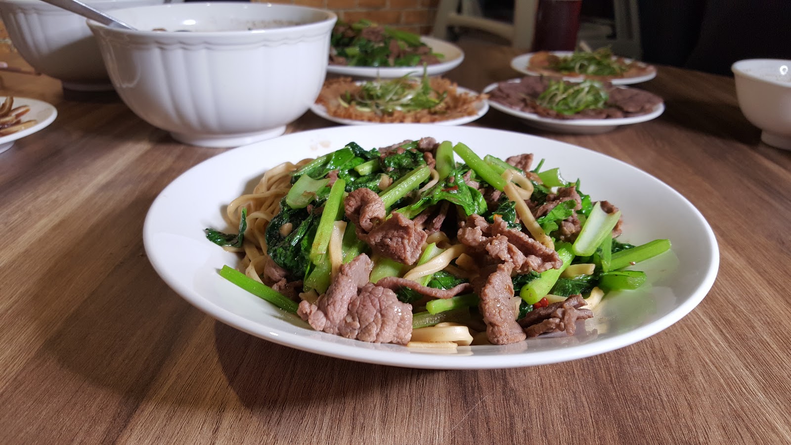 炒麵和燴飯的班底是相同的,油菜、牛肉片和豆瓣醬,只是主食換成了麵條。麵條和飯個性有些不同,燴飯的醬汁像是拌或在其中,而炒麵用的是生麵,吸附醬汁的功力更勝一籌。