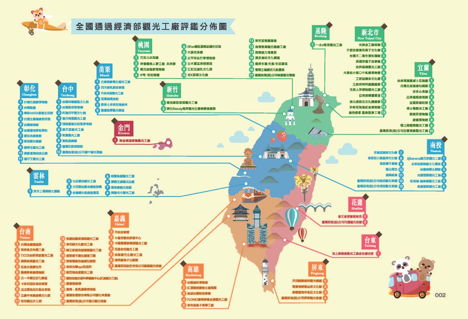截至2018/12/05日,全台灣總共有135間觀光工廠,其中以中部地區50家占37.0%最多,北部42家占31.1%次之,南部39家占28.9%再次之。
