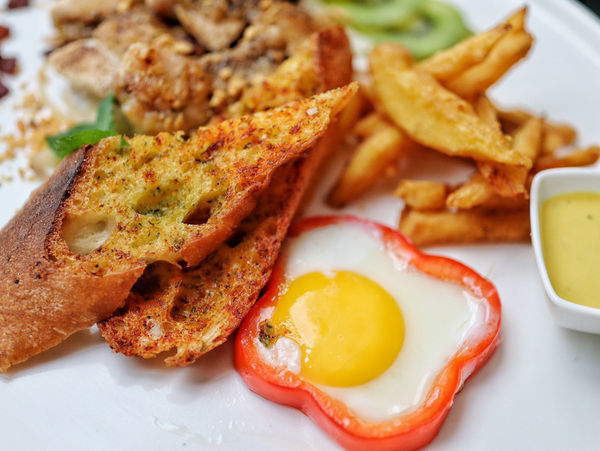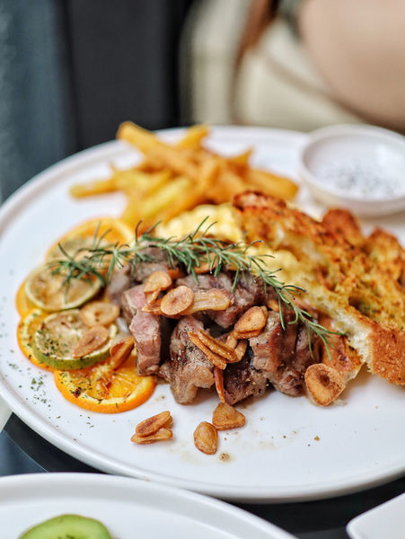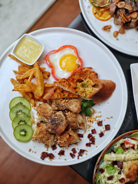 ▫️脆煎雞腿排雞皮煎到乾脆不油,肉質有厚度的彈性,切片奇異果、彩椒蛋都是比較少見且健康的食材,搭配的法式大蒜麵包優秀,外脆內韌,蒜香濃郁,有單點的實力!